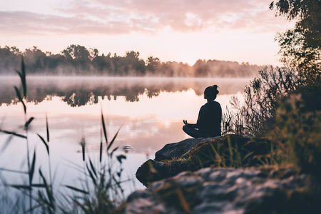 A masterful photograph depicts a person sitting in profound meditation in the heart of a tranquil wilderness Every intricate detail of nature from the delicate ripple of a nearby lake to the vibrant hues of foliage comes to life embracing the essence of mindfulness and connection to nature within the frame capture the profound stillness the gentle whispers of leaves and the tranquil aura that encapsulates the scene inviting viewers into a moment of peaceful introspection Let the photograph inspire a deep sense of calm unlocking the power of mindfulness and promoting mental wellbeing