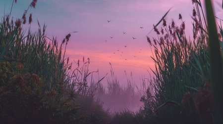 A serene scene captures a misty marsh at dawn, with tall grasses framing a vibrant pastel sky. Silhouetted birds soar gracefully, embodying tranquil nature and calmness.