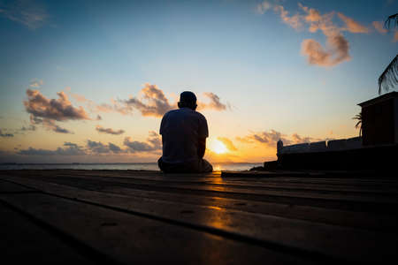 Man wearing facemask sitting on a rock watching the sunset at sea in Tanjung Aru Kota Kinabalu beach in Borneo Sabah Malaysia