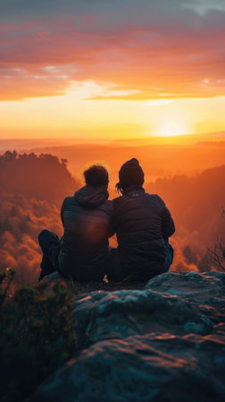 Two people are sitting on a rock and looking at the sunset. Scene is peaceful and romantic