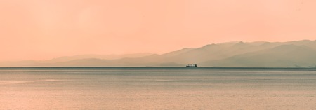 Panoramic view of ship at sunset with mountains