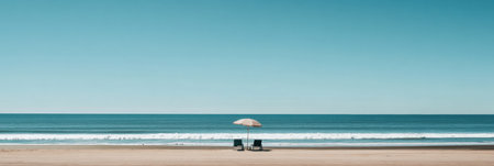 A tranquil beach features a lounge chair and umbrella beside gentle ocean waves, set against a clear blue sky, inviting relaxation.