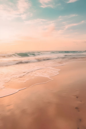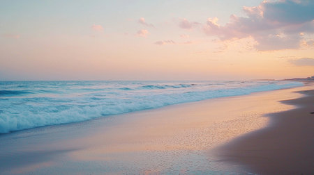 Waves gently rolling onto a sandy beach with a pastel sky in the background at sunset, A peaceful beach at sunset, with pastel skies and gentle waves crashing