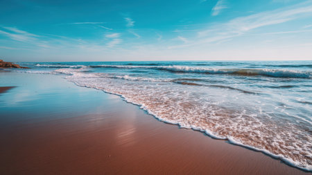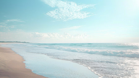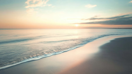 Experience the serene beauty of gentle waves lapping on a sandy beach at sunrise, where the soft morning light reflects off the calming ocean surface.