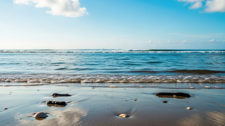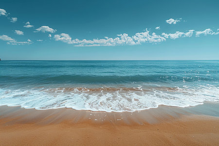A beautiful beach landscape with calm blue sea waves reaching the shore on a sunny day with a few clouds in the sky.