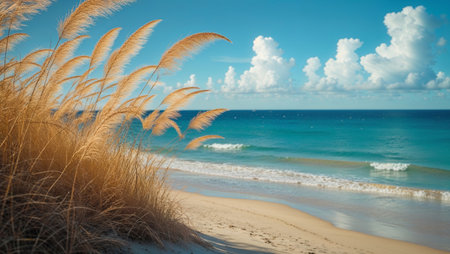 Golden beach grass swaying in the gentle breeze with turquoise ocean waves rolling onto a sandy beach and white clouds dotting the sky. Ai generated image