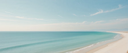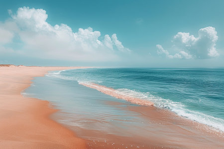 Sandy shoreline stretching out under a vibrant sky, with calm waves lapping on a warm, sunny day.
