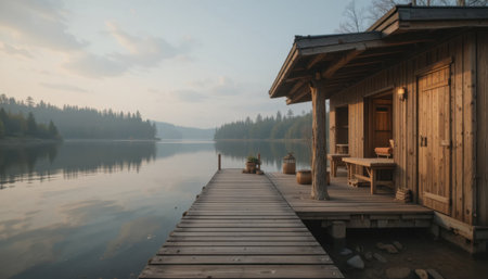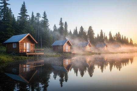 wooden cabins beside a misty early-morning lake, created with generative ai