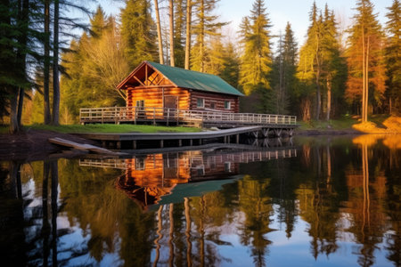 lodge in woods with a fishing pier on the lake, created with generative ai