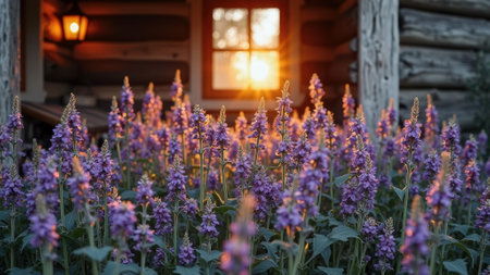 Sunset illuminating lavender blooms near rustic cabin window. That the image is generated using AI.