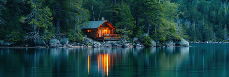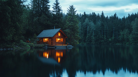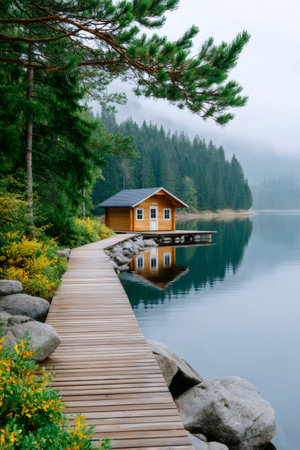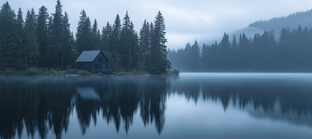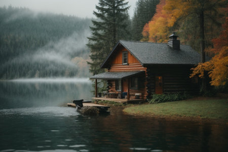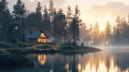 Cozy cabin by a serene lake surrounded by lush trees and misty atmosphere