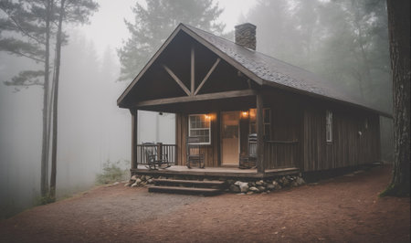 A cozy cabin sits in a misty forest, with lights on inside, inviting warmth and peace