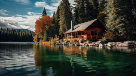 Wood cabin on the lake - log cabin surrounded by trees, mountains, and water in natural landscapes