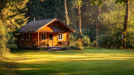 A peaceful wooden log cabin in serene autumn forest at sunrise. rustic mountain hut with warm sunlight and golden leaf for cozy nature getaway