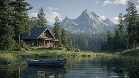 A picturesque landscape depicts a rustic cabin nestled by a serene lake with a rowboat, framed by lush evergreen trees. The scene is bathed in daylight, with a stunning backdrop of towering mountains under a clear blue sky. This image may be suitable for travel, nature, or environmental related projects.