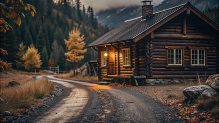 Charming wooden cabin nestled in a tranquil autumn forest, bathed in the warm glow of sunset, surrounded by vibrant orange leaves. Ai generated image
