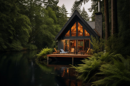 Serene lakeside cabin surrounded by lush forest. Beautiful nature landscape of modern house and calm river. Generative AI