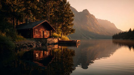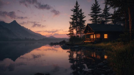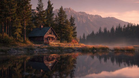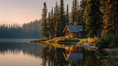 A charming wooden cabin sits peacefully beside a serene lake, surrounded by towering evergreen trees and a misty mountain backdrop at sunrise.