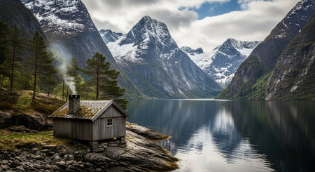 Nestled on a small rocky island, a rustic wooden cabin rises from calm waters. The surrounding mountains stand tall, their peaks covered in snow. The quiet atmosphere invites peaceful reflection.
