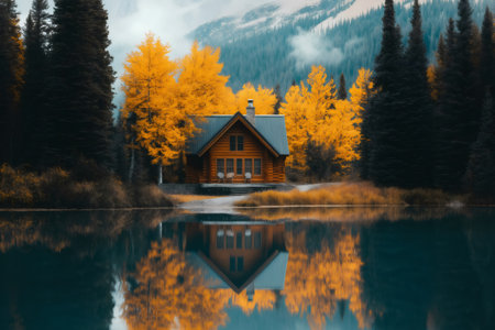 Cozy cabin nestled among golden autumn trees, perfectly mirrored in a calm lake, creating a peaceful and picturesque landscape