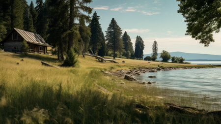 lakefront house nestled among tall trees on a lush grassy terrain, showcasing the stunning visuals of unreal engine 5. this image captures a romanticized depiction of the wilderness, with meticulous attention to detail in terms of fauna and flora accuracy. the rough, ultra-high-definition (uhd) quality of the image adds to its captivating appeal, reminiscent of the swiss style. ai generated