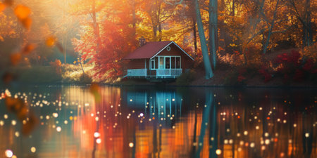 Lakeside cabin surrounded by vibrant autumn foliage reflecting on calm waters at sunset