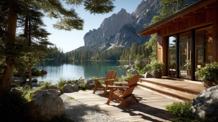 a cabin by a tranquil lake, fishing gear leaning on the porch, created with generative ai