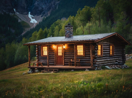 Cozy log cabin nestled in a scenic mountain landscape.