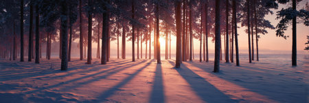 Frozen forest with tall trees casting long shadows as the low sun touches the snow in winter. The atmosphere feels cold and reflective.