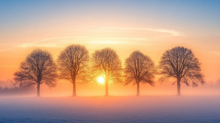 A beautiful winter sunrise illuminates a row of silhouetted trees in a foggy landscape, creating a serene and tranquil atmosphere perfect for nature lovers.