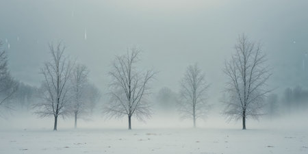 A serene winter landscape featuring four frost-covered trees standing gracefully in a misty backdrop, evoking a peaceful and tranquil atmosphere.