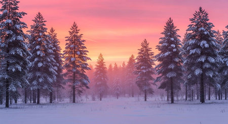 Line of snow covered trees stretches into the distance, gradually blending into a vibrant winter sky with hues of pink and blue, creating a serene and mystical landscape