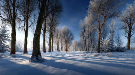 A wide, low-angle view shows a snow-covered path stretching into the distance, flanked by rows of trees. The trees are heavily adorned with frost, their branches creating intricate patterns against a clear, bright blue sky. Sunlight casts long, sharp shadows across the pristine snow, highlighting the textures of the winter landscape.