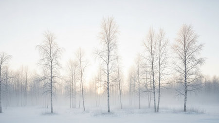 A serene winter landscape featuring a grove of bare trees enveloped in a soft, ethereal mist. The pale light of dawn or sunrise gently illuminates the scene, creating a tranquil and peaceful atmosphere. The ground is covered in snow, and the delicate branches of the trees are visible through the fog, creating a delicate and muted visual.