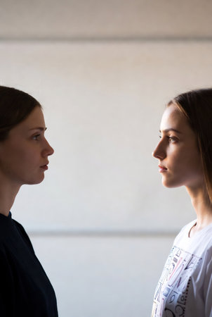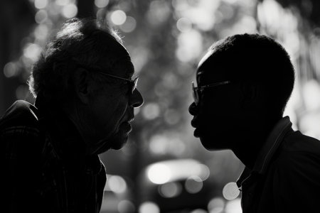 Two distinct figures are depicted facing each other in a contrast of light and shadow. Their profiles create a striking visual composition of connection and confrontation.