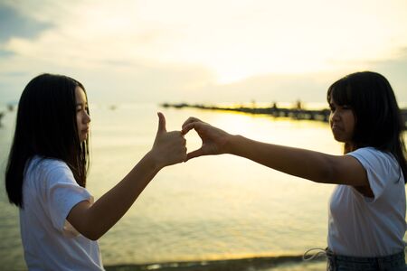 two asian teenager playing at sea beach against beautiful sunset sky
