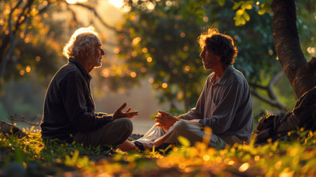 Elderly man with a therapist in a serene outdoor setting, practicing mindfulness and relaxation techniques to manage dementia symptoms.