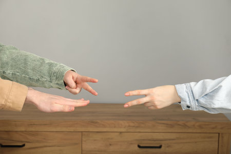 People playing rock, paper and scissors indoors, closeup