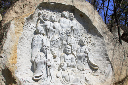 Stone sculptures of Buddhist monks in Nanshan Park, China. General view, daytime, summer
