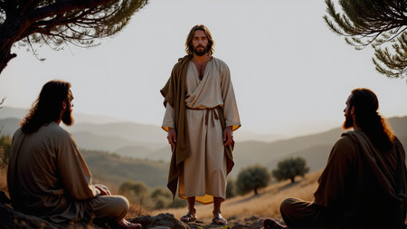Jesus looking directly with two disciples in Galilee, symbol of leadership, teaching, faith, devotion, inspiration and the biblical path of Christianity.