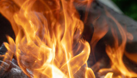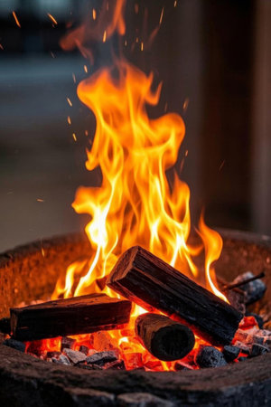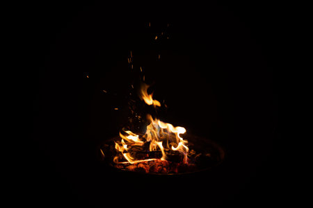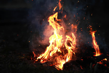 Sparkling flames from burning firewood outdoors