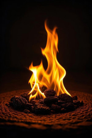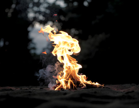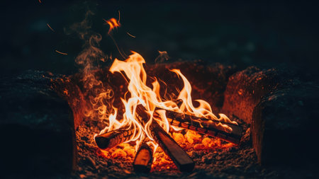 AI Generated. Bright flames dance above glowing embers in a dark setting during a nighttime display of fire
