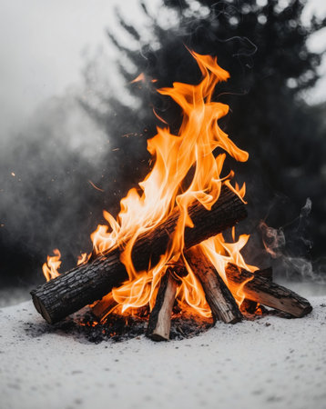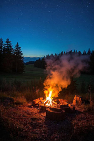A captivating campfire radiates warmth and light during dusk, surrounded by a serene outdoor setting. The flickering flames and smoke create a cozy atmosphere, perfect for relaxation and adventure.