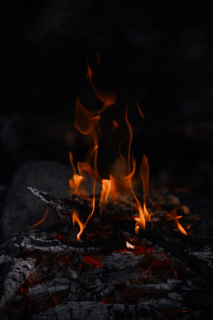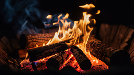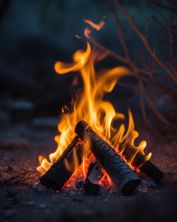 This image depicts a campfire with vibrant orange and yellow flames against a dark backdrop. The flames consume wooden logs creating a warm visual. The composition suggests an outdoor environment likely during the evening or night. Suitable for illustrating various themes, it may be used for editorial and commercial purposes.