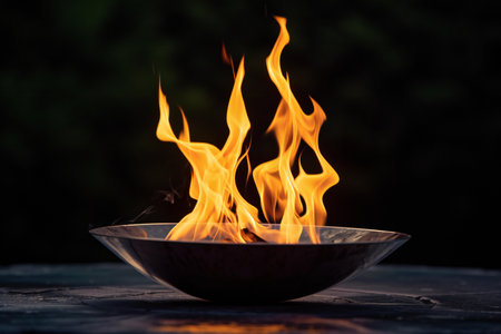 Burning fire in a bowl on a wooden table with dark background