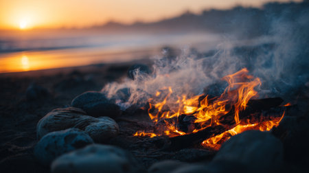 A serene beach scene featuring a vibrant bonfire with glowing flames surrounded by smooth stones, as the sunset casts a warm light over the calm ocean waves.