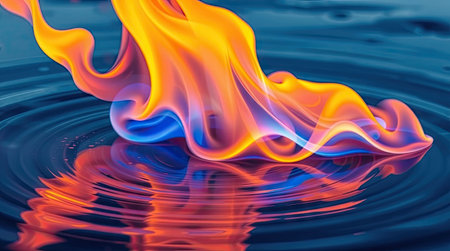 An artistic illustration presents a vibrant flame appearing to emerge from a water surface. The composition features a dynamic interplay of warm orange and yellow hues contrasted against cool blue tones. The reflection creates a symmetrical pattern, and the image may be useful for various creative and conceptual projects.