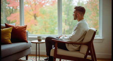 A cozy living room with modern furniture, large windows showcasing autumn foliage, warm tones, and stylish decor