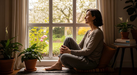 A woman sits peacefully on a rug near a large window, looking out at a lush green garden. Surrounded by potted peace lilies, she enjoys a quiet moment of relaxation and contemplation in her home.