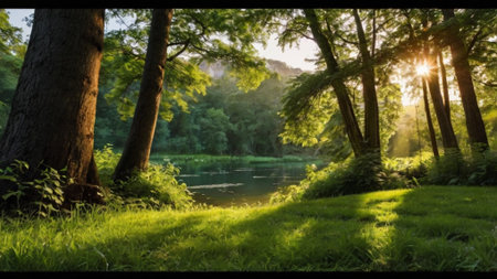 Golden sunlight filtering through lush green foliage, creating a peaceful and serene natural environment, perfect for outdoor and nature themes.